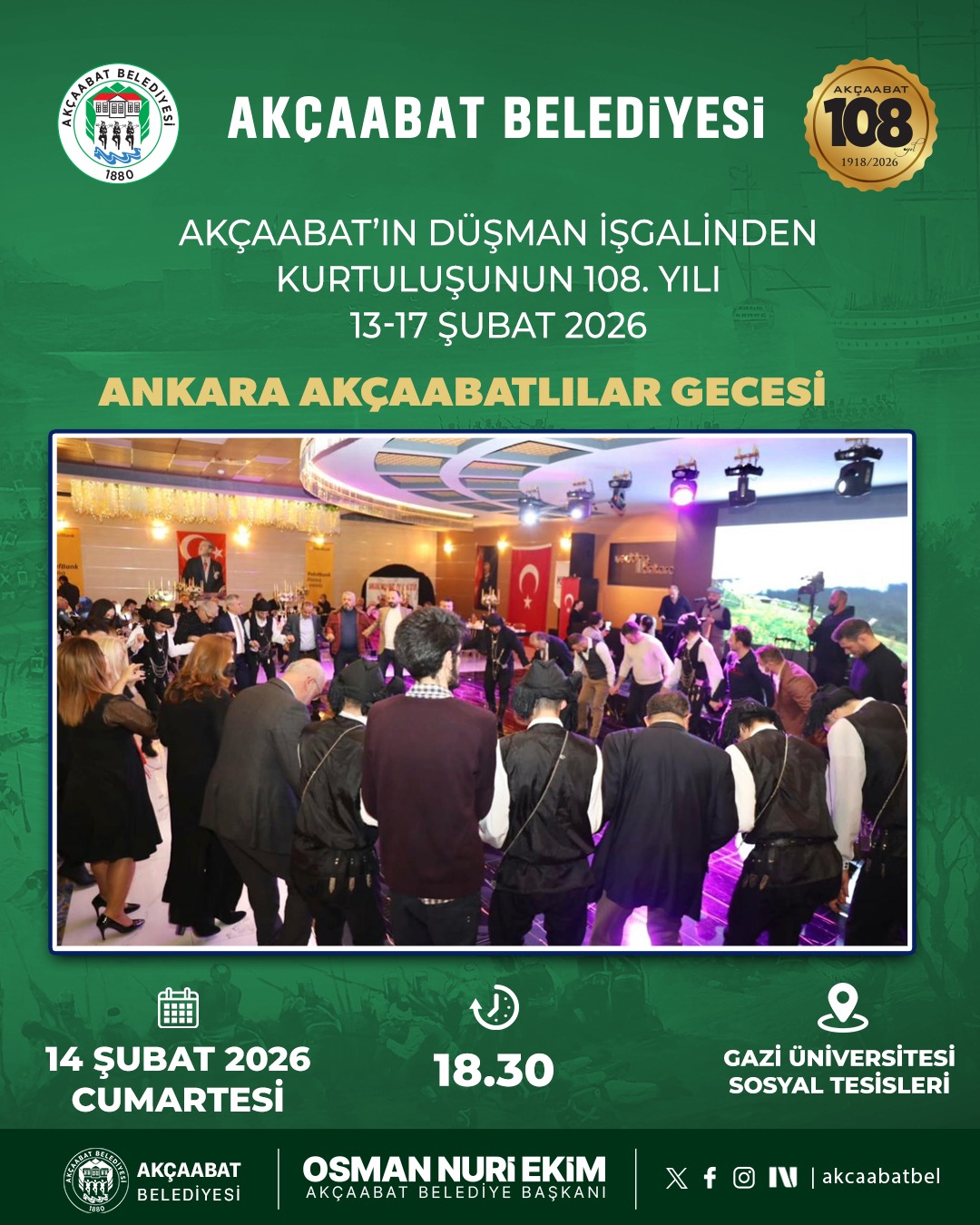 Kurtuluş Haftası programı, 13 Şubat 2026 Cuma günü şehit ve gazilerimiz için Dürbinar Mahallesi Mezarlık Camii’nde okutulacak Kur’an-ı Kerim tilavetiyle başlayacak. 14 Şubat Cumartesi günü Ankara’da düzenlenecek Akçaabatlılar Gecesi ile hemşehrilerimiz bir araya gelirken, 14–15 Şubat tarihlerinde Akçaabat Belediyesi Yarı Olimpik Yüzme Havuzu’nda 18 yaş üstü yüzme yarışmaları gerçekleştirilecek.