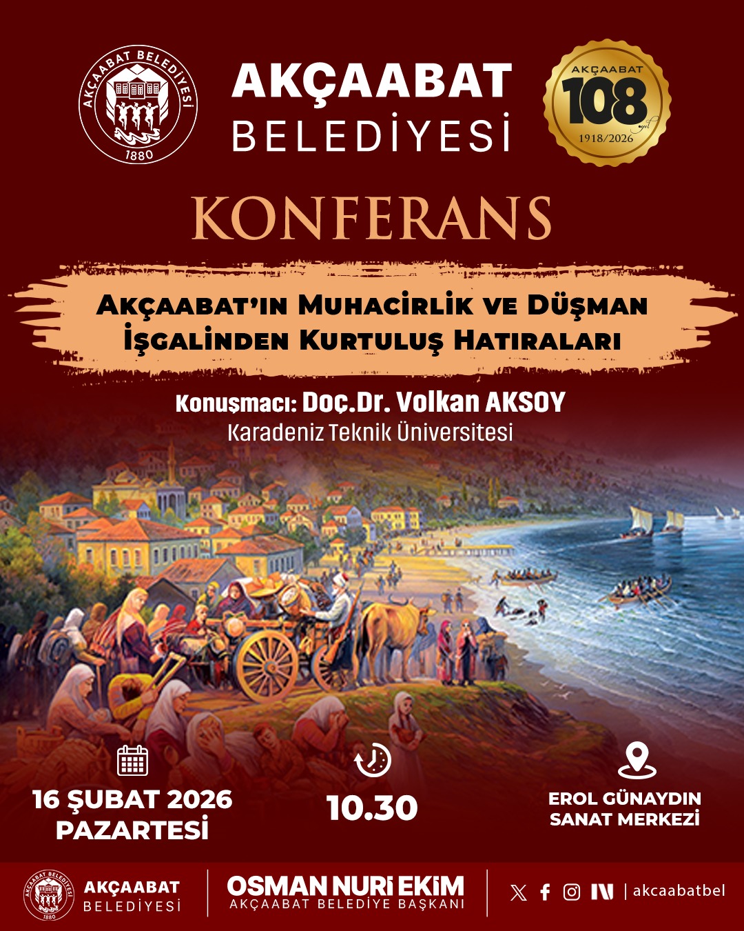 15 Şubat Pazar günü çocuk ve ailelere yönelik tiyatro gösterisi Erol Günaydın Sanat Merkezi’nde sahnelenecek. 16 Şubat Pazartesi günü ise “Akçaabat’ın Muhacirlik ve Düşman İşgalinden Kurtuluş Hatıraları” konulu konferans ile tarihî süreç ele alınacak.